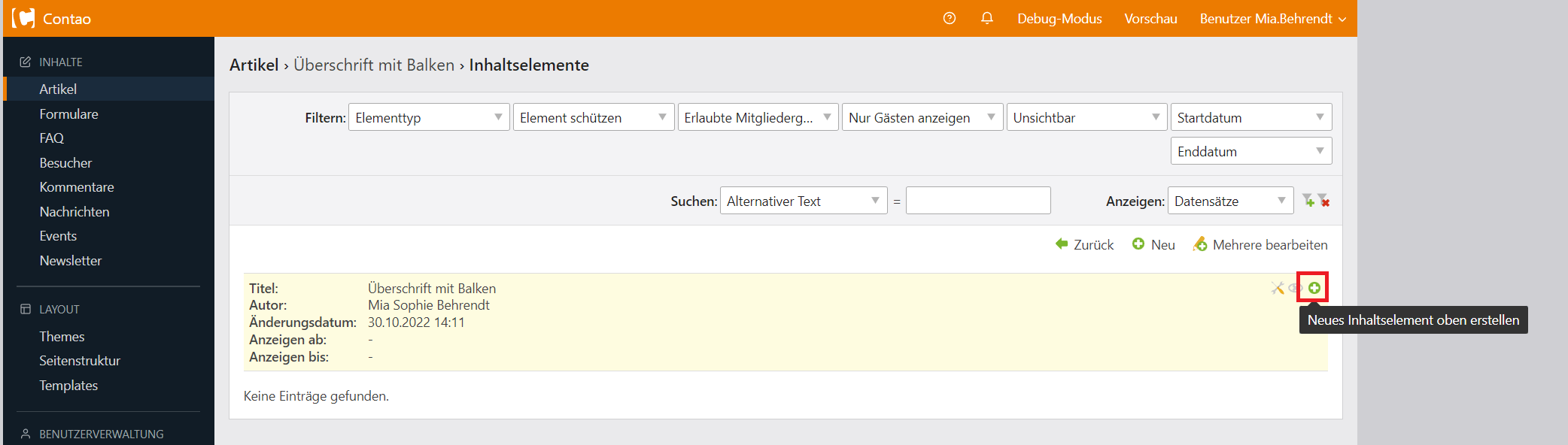 Neues Inhaltselement anlegen. Dies muss der erste Eintrag sein.